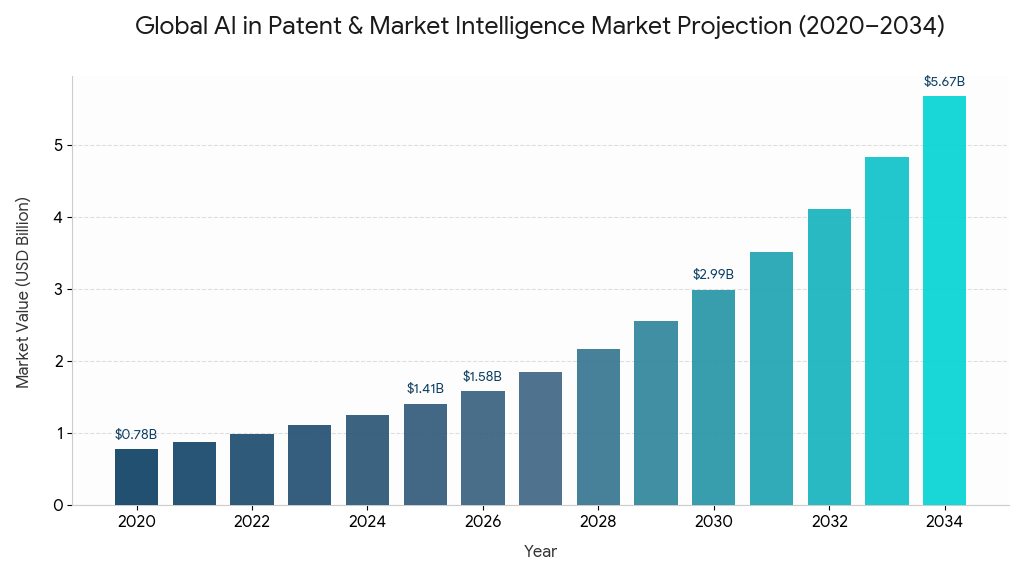 포춘 비즈니스 인사이트에 따르면, 전 세계 특허 및 시장 정보 분야의 AI 시장은 인공지능과 지적 재산 관리의 교차점에서 혁신적인 변화를 가져오는 분야입니다. 2025년 14억 1천만 달러 규모였던 이 시장은 2026년 15억 8천만 달러에서 2034년 56억 7천만 달러로 크게 성장할 것으로 예상되며, 예측 기간 동안 연평균 17.30%의 견조한 성장률을 보일 것으로 전망됩니다. 이러한 놀라운 성장세는 특허 분석 및 전략적 시장 정보 프로세스에 첨단 AI 기술이 점점 더 많이 통합되고 있음을 반영합니다.