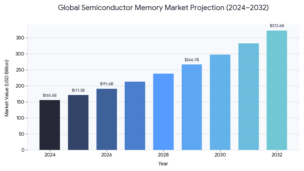포춘 비즈니스 인사이트에 따르면, 전 세계 반도체 메모리 시장은 현대 디지털 인프라의 핵심 기반으로서 거의 모든 전자 기기 및 시스템에서 데이터 저장 및 처리를 가능하게 합니다. 2024년 1,555억 4천만 달러 규모였던 이 시장은 2025년 1,713억 1천만 달러에서 2032년 3,726억 5천만 달러로 크게 성장할 것으로 예상되며, 예측 기간 동안 연평균 11.7%의 견조한 성장률을 보일 것으로 전망됩니다. 이러한 인상적인 성장세는 반도체 메모리가 신흥 기술과 다양한 산업 분야의 디지털 전환을 지원하는 데 있어 중요한 역할을 한다는 것을 보여줍니다.