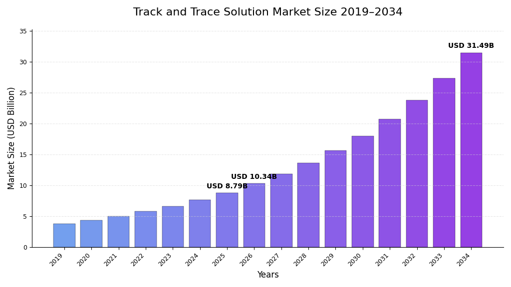 포춘 비즈니스 인사이트에 따르면, 전 세계 추적 및 추적 솔루션 시장은 기술 발전과 산업 전반에 걸친 규제 요건 강화에 힘입어 견조한 성장세를 보이고 있습니다. 2025년 87억 9천만 달러 규모였던 이 시장은 2026년 103억 4천만 달러에 도달하고 2034년에는 314억 9천만 달러까지 확대될 것으로 예상되며, 예측 기간 동안 연평균 14.90%의 성장률을 기록할 것으로 전망됩니다.